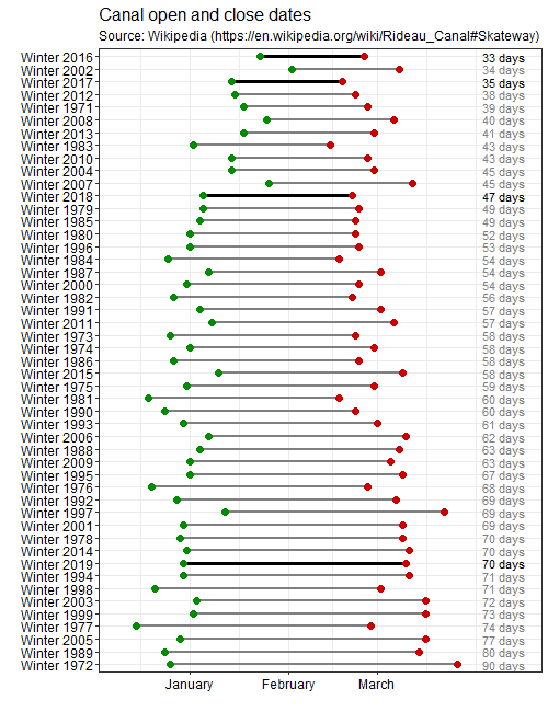 highlight=ifelse(winter_season %in% c("Winter 2019","Winter 2018","Winter 2017","Winter 2016"), "Yes","No"))Here I visualize the start and end of each of the past 49 canal skating seasons. I have highlighted the past 4 seasons as well.