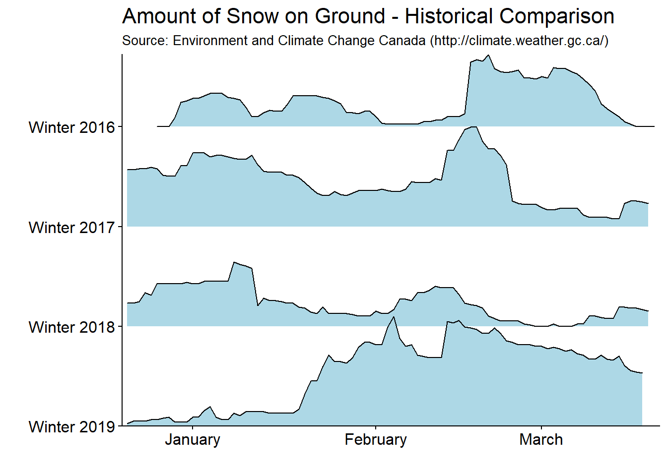 labs(title="Amount of Snow on Ground - Historical Comparison", subtitle="Source: Environment and Climate Change Canada (http://climate.weather.gc.ca/)", x="", y="") +