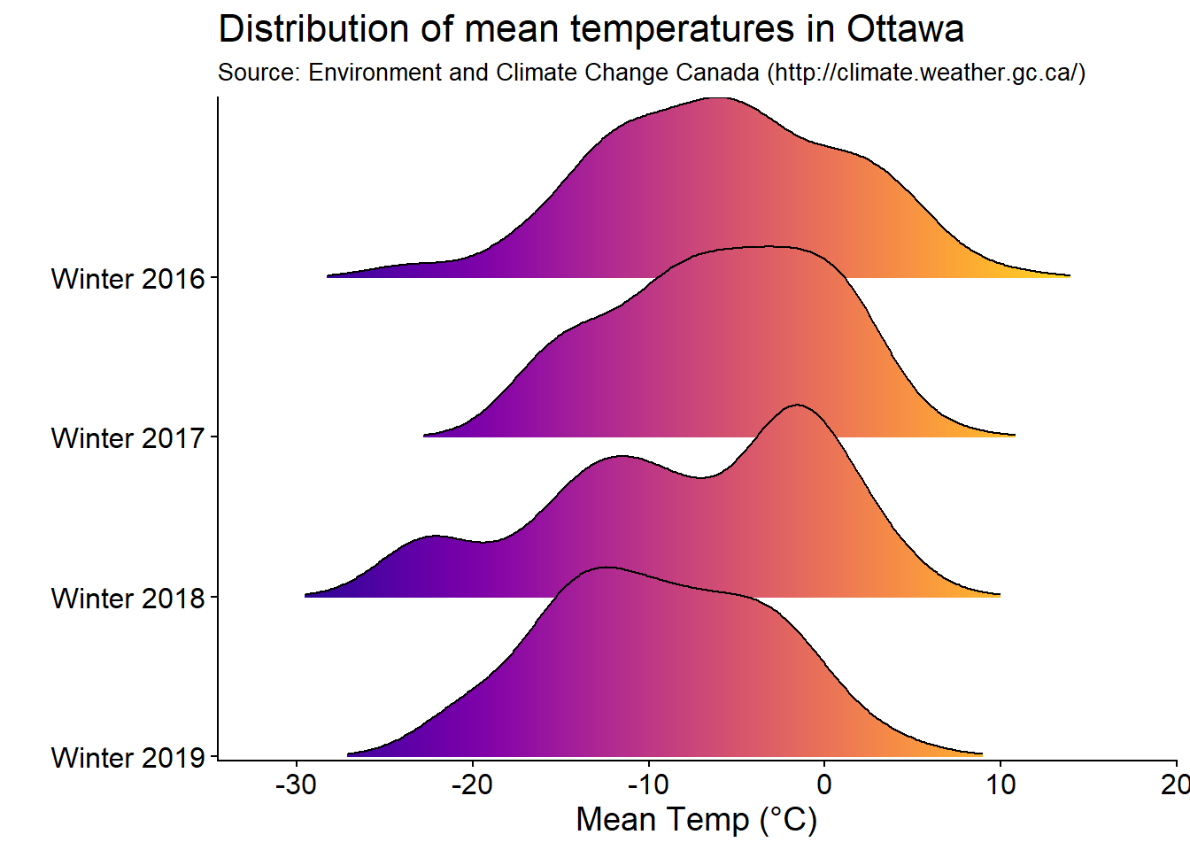 Now I wanted to look at the distribution of mean daily temperatures over the past four winters.