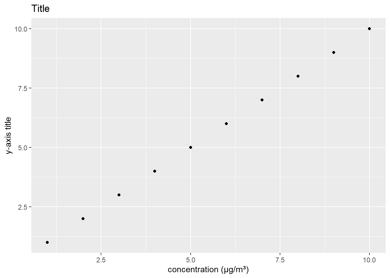 I often need to label the axis of a plot with units such as “(µg/m³)”. The below example shows how you would do this.