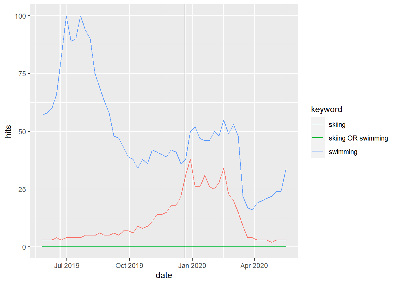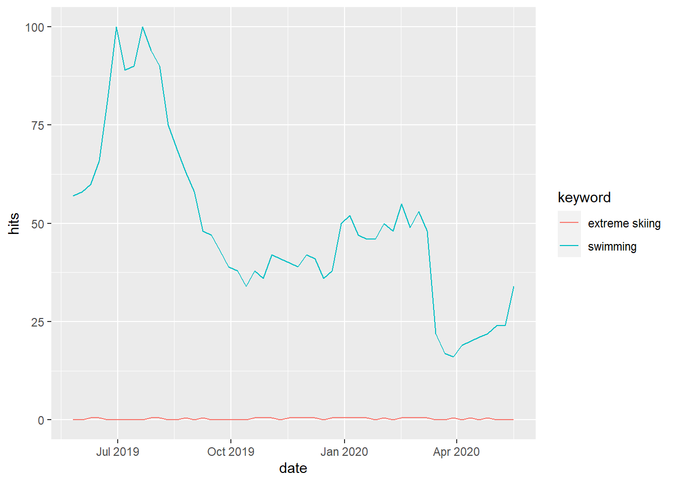 search4<-gtrends(c("skiing OR swimming","skiing","swimming"), time= "today 12-m", geo = "CA")