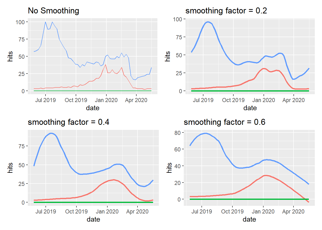 plot_smooth_20<-ggplot(time_trend4, aes(x=date, y=hits, colour=keyword)) +
