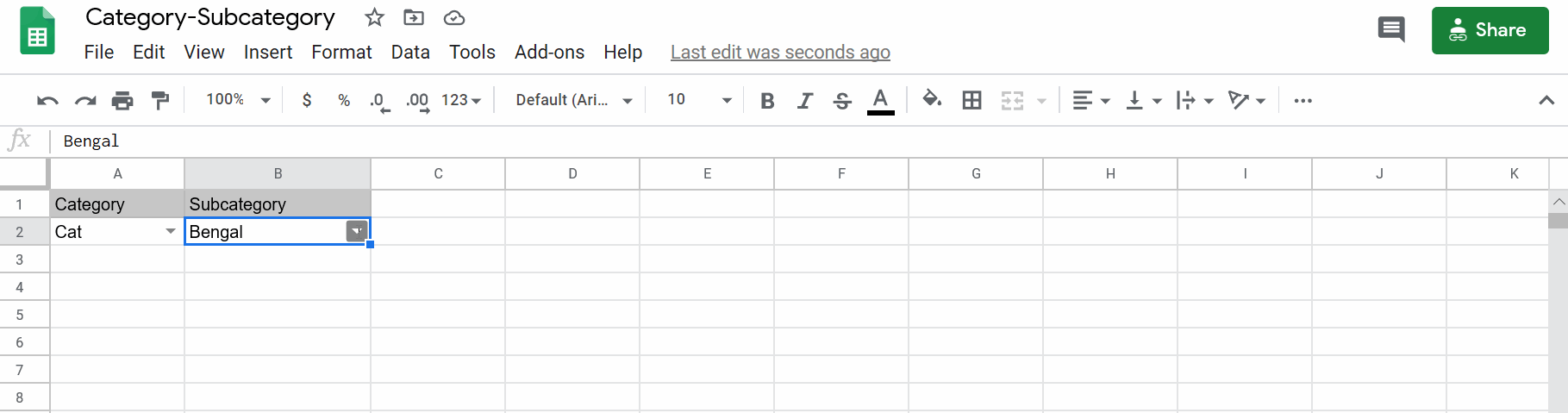 In one cell, you create a dropdown for the primary category as you normally would (Data -> Data Validation -> List from a range, then enter the name of the named range you created, ie. “Categories”)