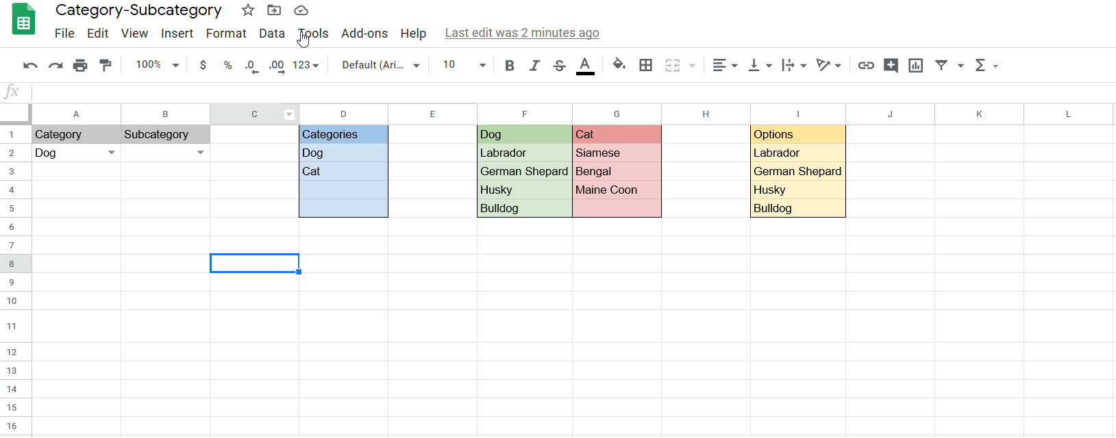 You will probably want to change the sheetname from “Methods 2” to the name of the sheet in your workbook. If you want to have the Category in a different column, you would just substitute the column number in Column == 1, similarly you can change where the subcategory column will be by changing the value in var Target = SpreadsheetApp.getActiveSheet().getRange(Cell.getRow(), Column + 1);.
