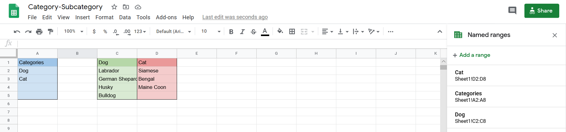 This method is for when you only need to have only a few of these category-subcategory dropdown lists on the sheet.