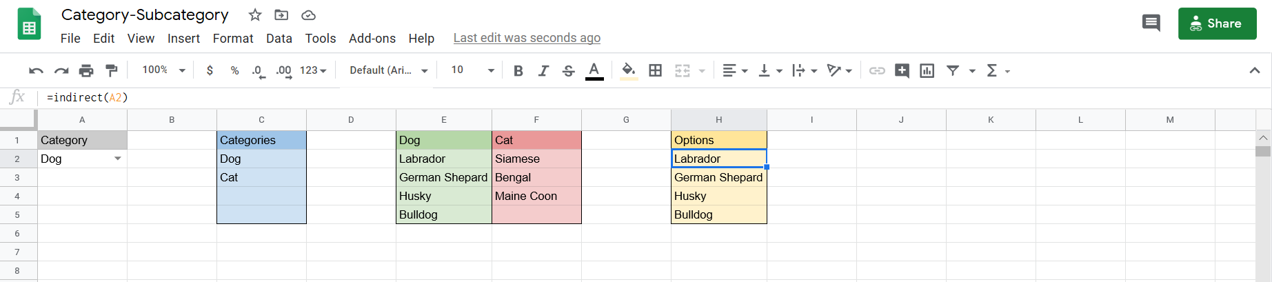 In order to generate a list of the possible subcategory options, we select a new column, and use the INDIRECT() function with the cell containing the primary category as input. In my case, it would look like INDIRECT(A2). This will create a list of all the possible subcategories of our selected primary category.