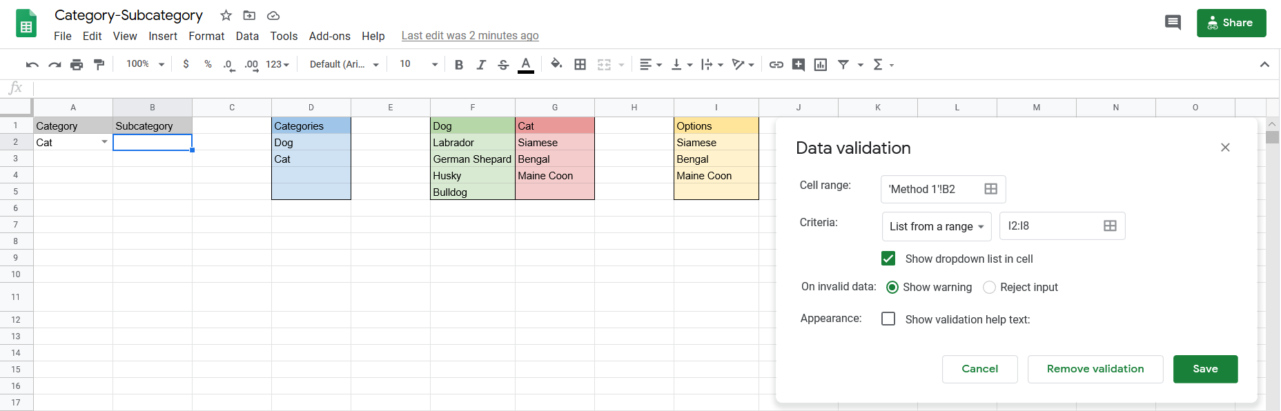 I found two ways of doing this - Method 1 is a simpler technique for when you only need one or two of these in a sheet, and Method 2 is for when you need many of these category-subcategory drop down lists as in a larger table or for data entry.