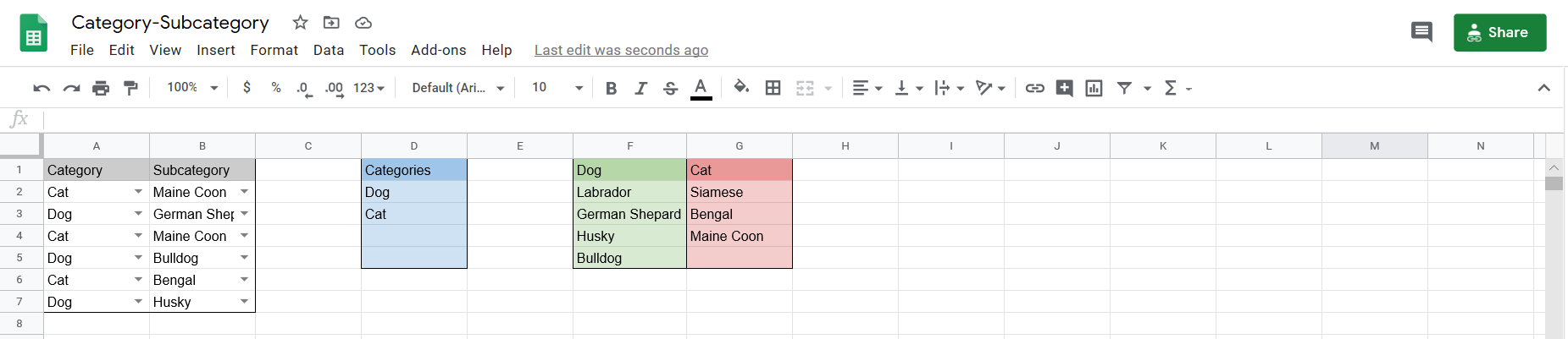 This method is for when you only need to have only a few of these category-subcategory dropdown lists on the sheet.